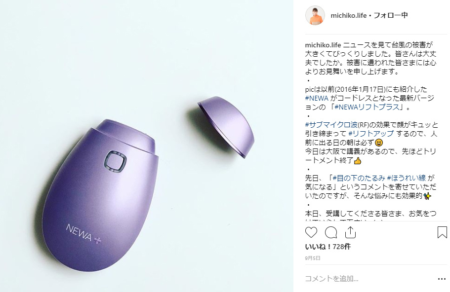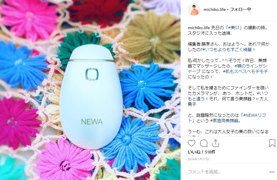 私の場合は、藤原美智子んさんがご愛用ということでNEWAリフトを使ってみたいなと思いました。数々の美顔器を試されているプロの意見はとても参考になりますし、説得力がありますよね。