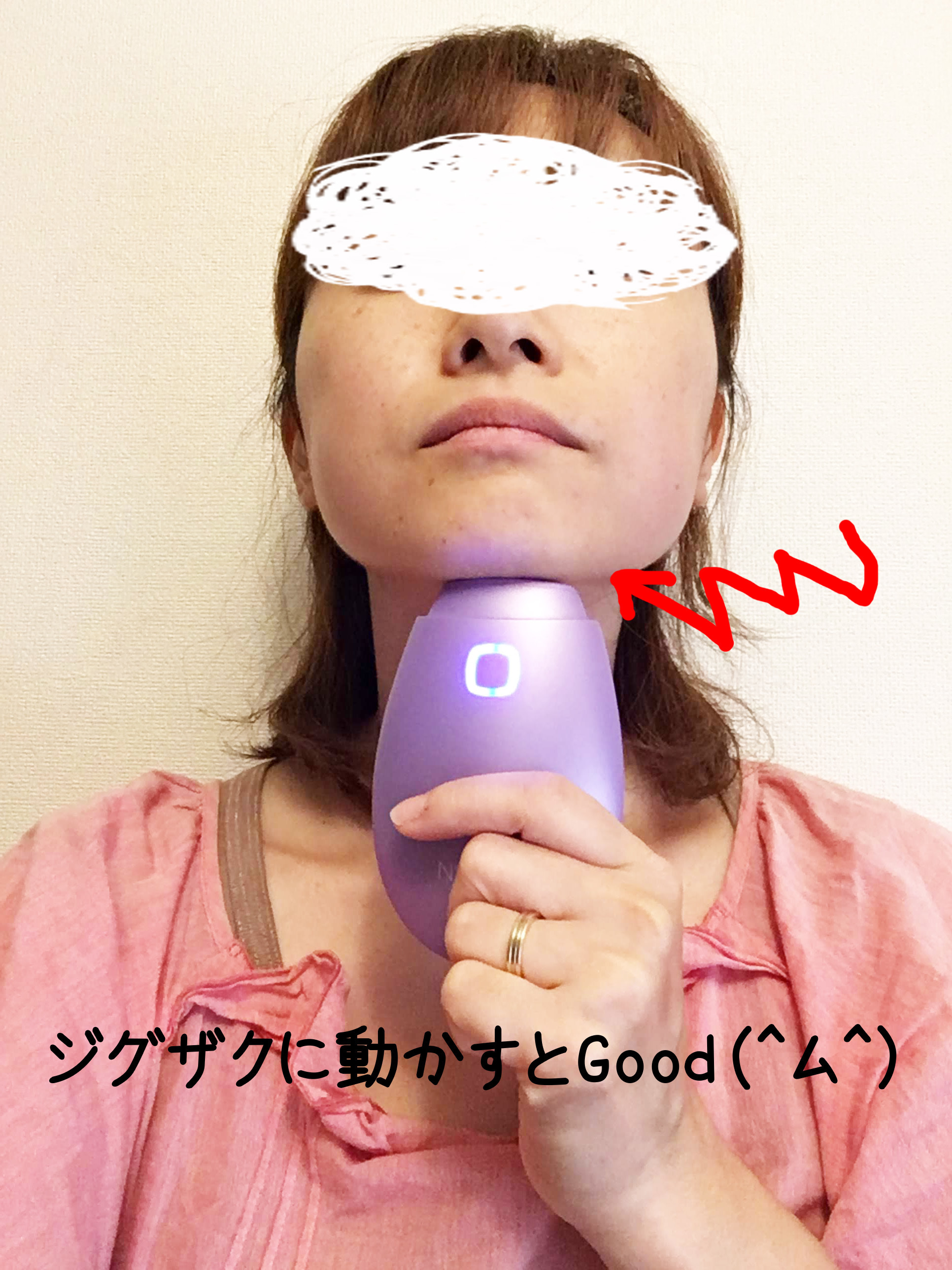 今回からケアの方法をちょっと変えてみたのです。頬と同じようにくるくるケアしていたのですが、ジグザグした動きの方があごの下のお肉に電極部分が密着してくれるので、丁寧にケアできるようになりましたよ。