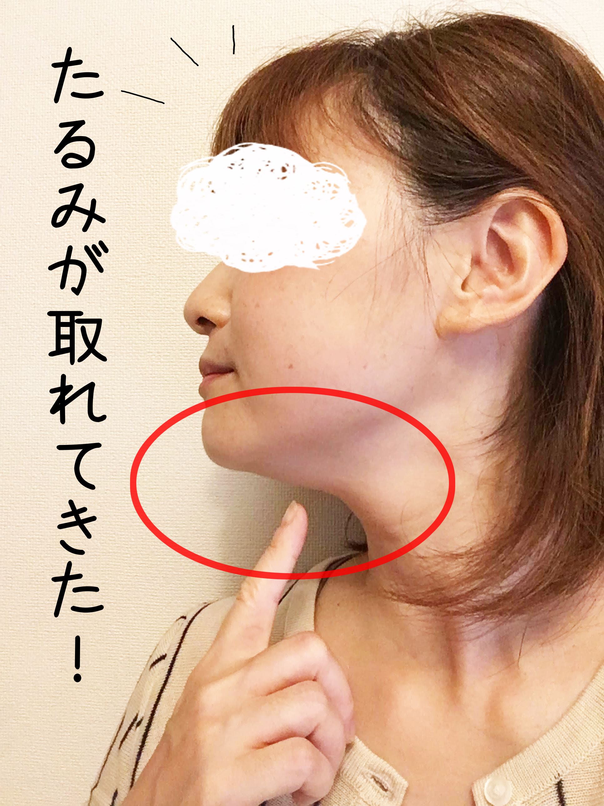 ほんの少しの変化ですが、ようやくあご下の肉に変化を感じることができました。触った感じ、お肉が落ちているのがわかりました。写真はケア後5分以内に撮影したものですので、あと3時間もすればより引き締まった感じになると思います。