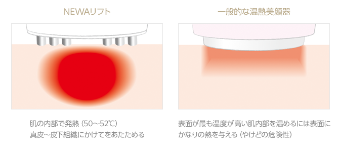また、NEWAリフトは肌の深層部を50℃から52℃に温めてくれることで、肌の表面だけ温めてやけどの危険性がある他の温熱美顔器と比べても、安全で効果も確実です。