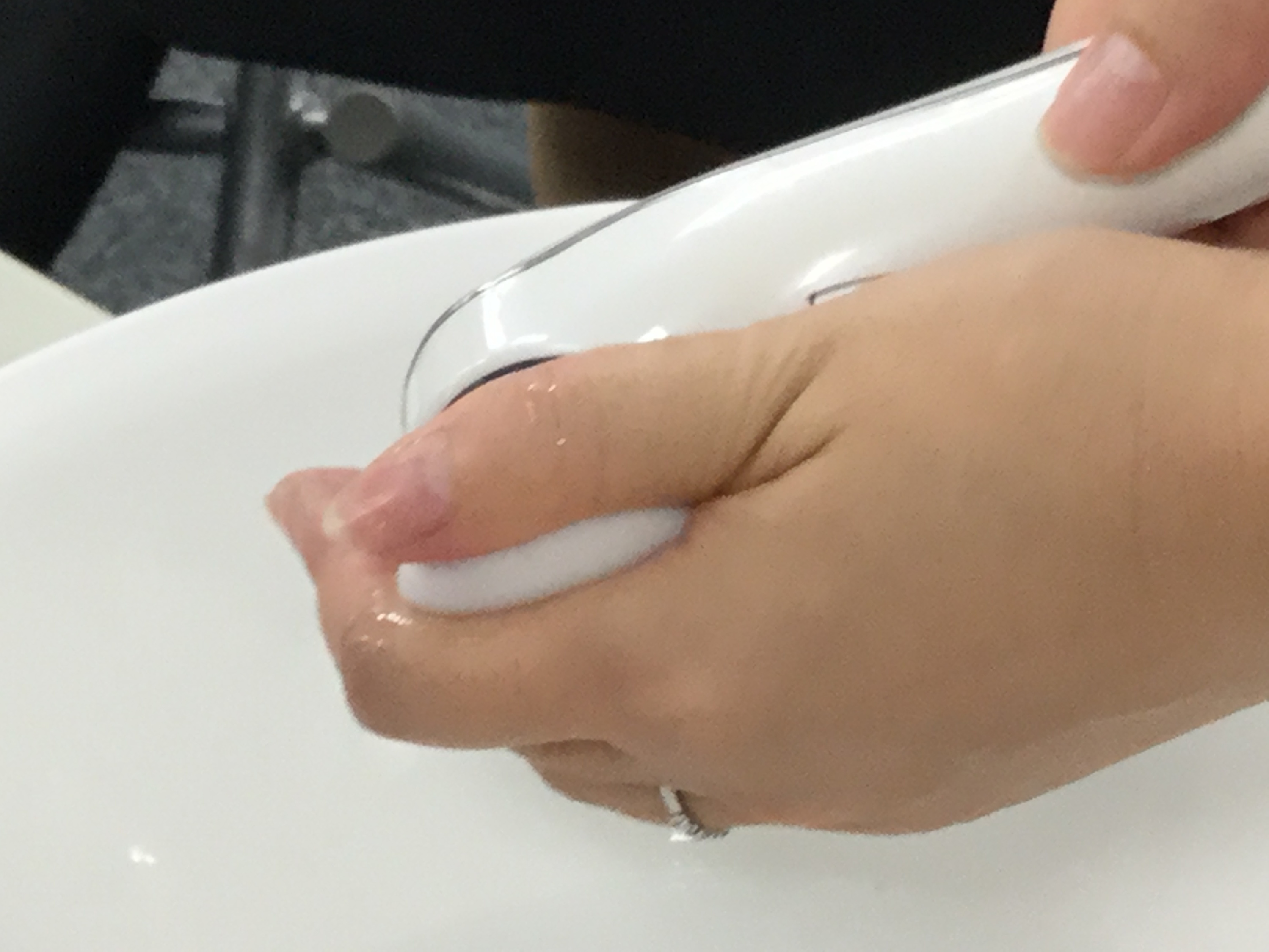 この横ラインに触れることでイオンが発生し、イオンの力で毛穴の奥まで汚れを掻きだすというもの。また、イオンの力で汚れの再付着も防ぎます。